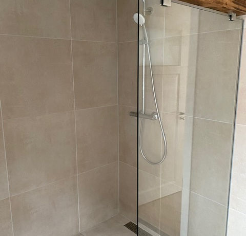 De gigantische badkamer bereik je eveneens vanuit de hal en via een kleine tussenhal. De moderne badkamer is voorzien van toilet (vrijhangend), een grote inloopdouche, ligbad en twee wastafels. Ook beschikt de badkamer over een raam voor daglichttoetreding en ventilatie.